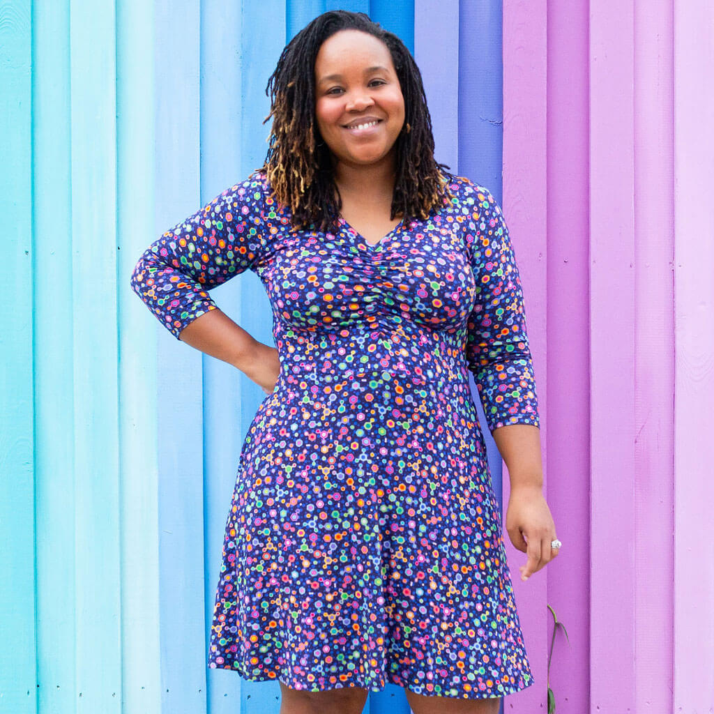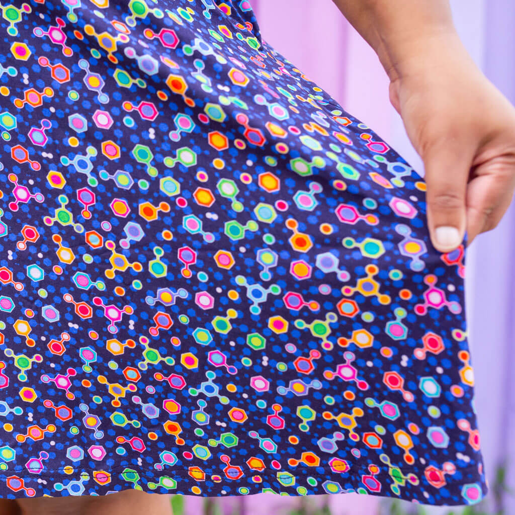 Though colorless in nature, these hydrocarbons come in a whole rainbow of bright colors - neon green, sunflower yellow, fiery red, ice blue, and more on a dark cobalt blue background. Geek out by seeing how many you can identify using shape and color as context clues! Soft, comfortable viscose with a bit of spandex makes this dress an all-day winner, with ruching at the bust.